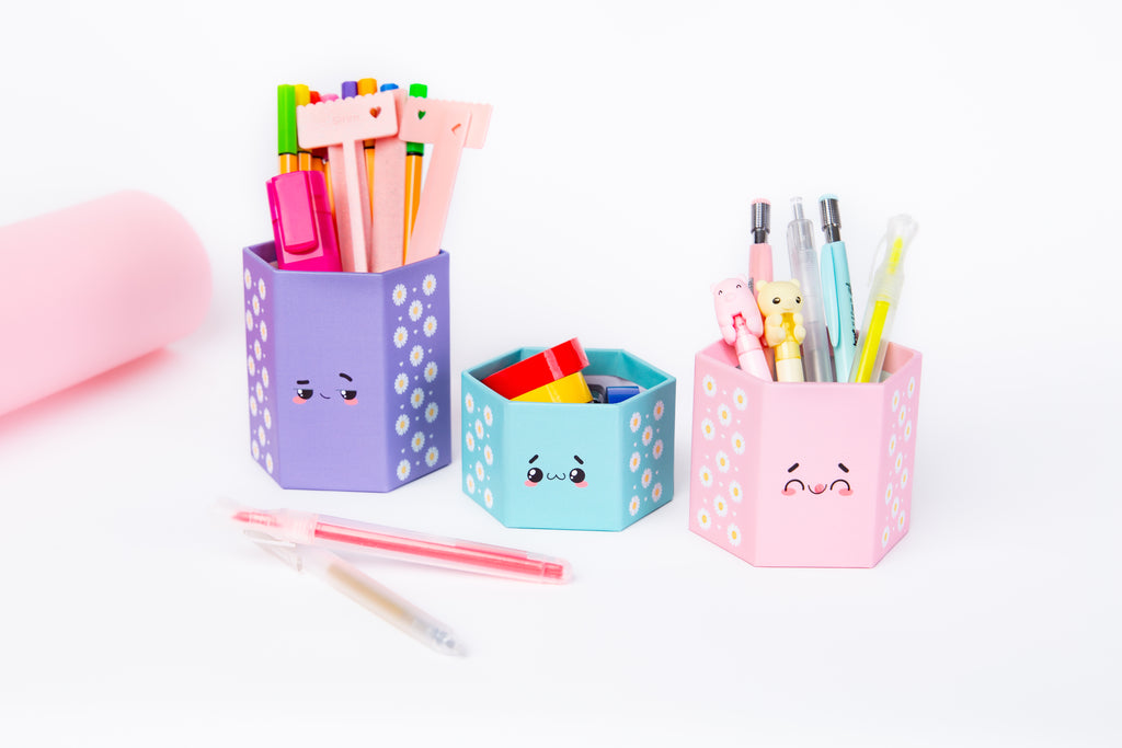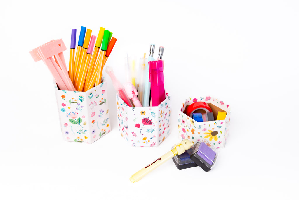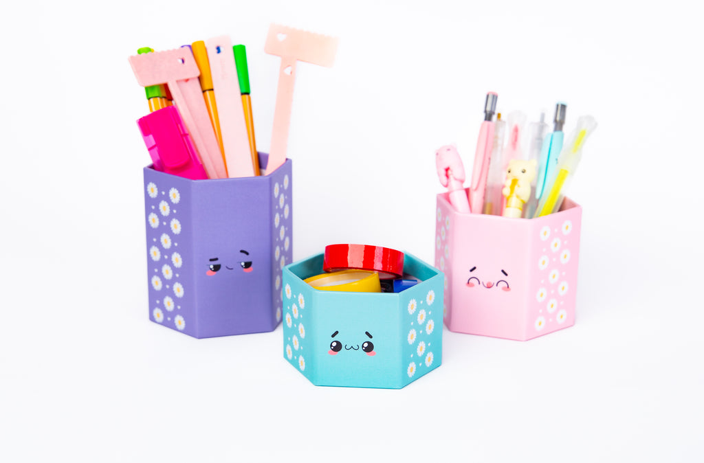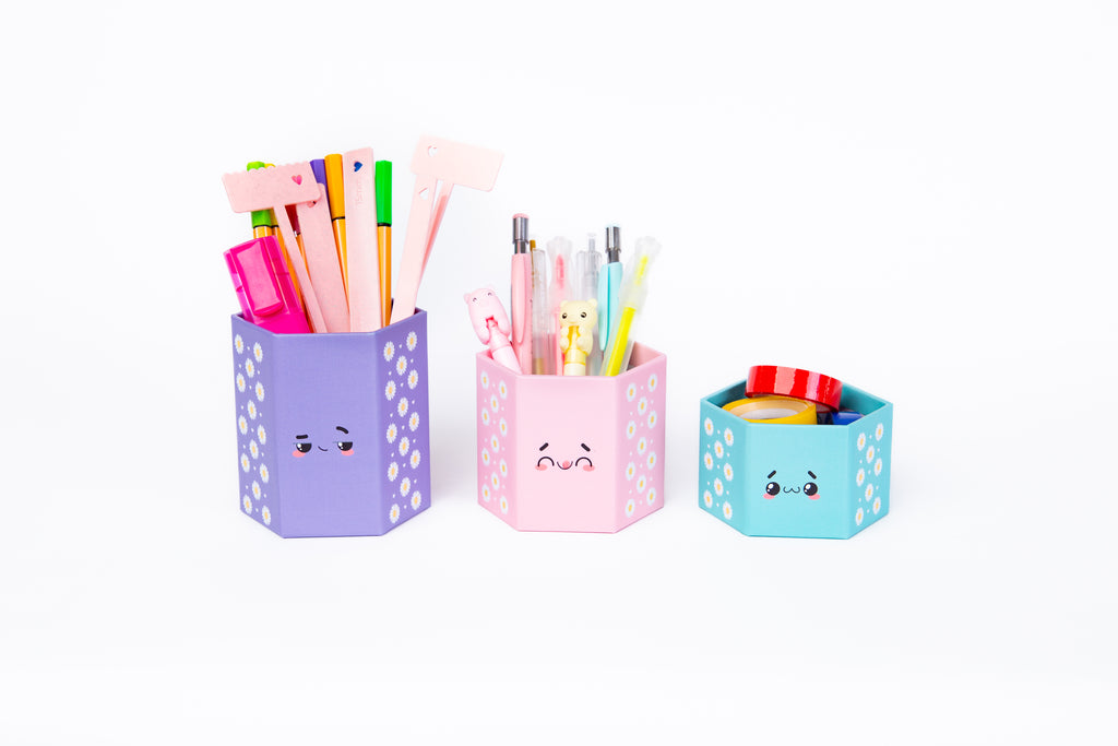 Caixa Hexagonal de cartonagem 100% artesanal, feita em papelão corte e vinco e laminada para maior durabilidade. Totalmente personalizada, ideal para organizar canetinhas e lápis na mesa escolar ou de escritório, depois pode ser reutilizada como porta treco, porta lápis ou enfeite exclusivo e durável.
